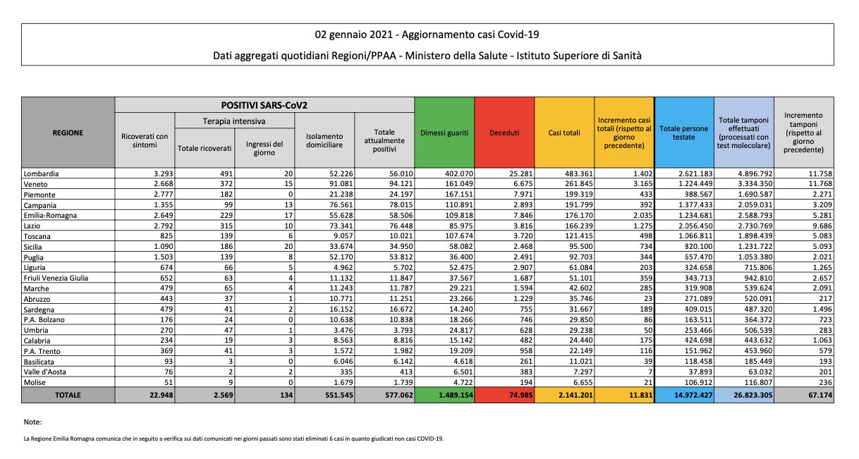 Con il bollettino di oggi 2 gennaio, il ministero della salute comunica che il numero dei contagiati da corona virus ad oggi è aumentato ma meno di ieri.