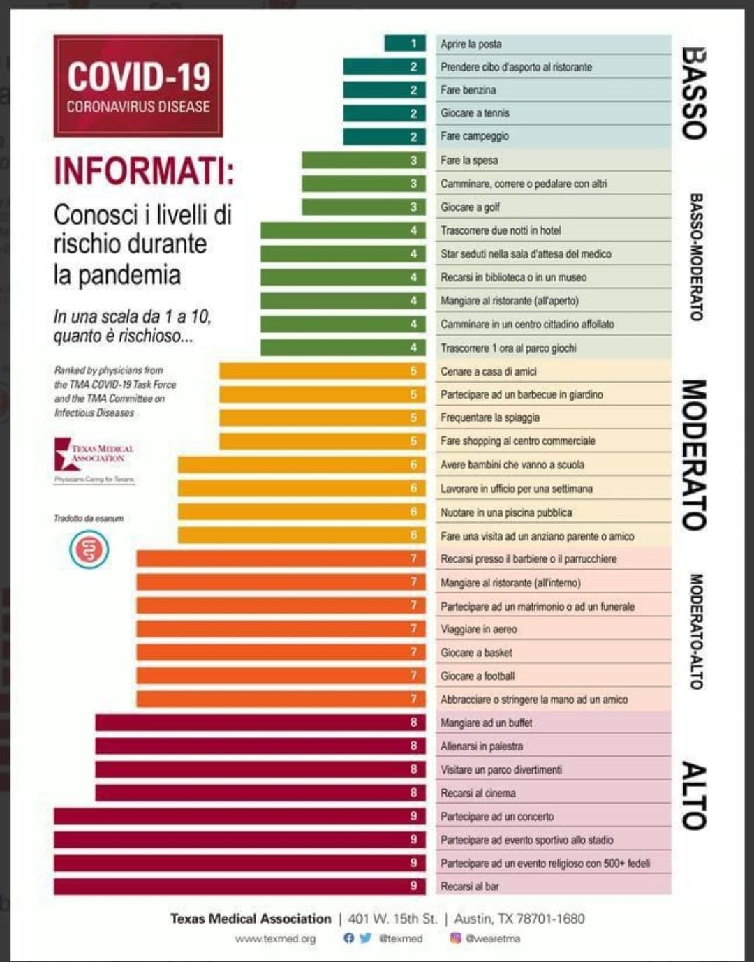 Dobbiamo dirlo di nuovo: se prendiamo singolarmente bar, ristoranti, palestre, sport di vario genere, queste attività possono essere considerate a basso rischio. Soprattutto se gestite in modo corretto e rispettoso delle regole. Sappiamo purtroppo, e ognuno di noi ne ha evidenza quotidiana, che insieme a molti bar, ristoranti, palestre e così via dove le regole di prevenzione sono applicate attentamente, ce ne sono almeno altrettanti dove questo non accade. E purtroppo, con il nuovo Coronavirus, non tutti i luoghi sono uguali. Cambia molto il rischio legato alle modalità di svolgimento di un’attività.