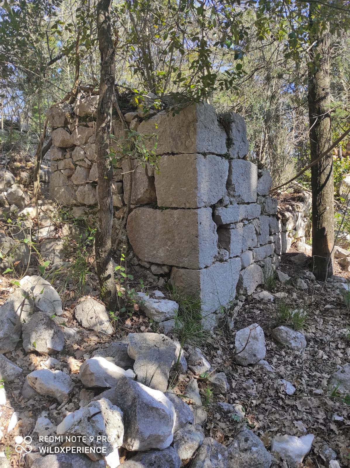 Il tempo scorre, riprendo il cammino, raggiungo rapidamente la sommità di un colle. Un bel prato, con bellissime rose canine mi regala una visuale inedita dell’Abbazia che da sempre sorveglia e vigila sul territorio cassinate. Cosa nota e ben chiara agli invasori durante la seconda guerra mondiale, ma anche ai popoli che li hanno preceduti. Avendo deciso di tracciare una nuova “via”, abbandono il sentiero e mi avventuro in una area con vegetazione folta, il carpineto fittissimo fa da padrone, ma non ostacola il mio avanzare incessante. Inizio a salire su una dorsale caratterizzata da pietre sciolte fino a quando non mi trovo dinanzi a delle vere e proprie mura di cinta. Il tempo di realizzare di cosa si trattasse ed ecco altri ruderi ad indicarmi una vera e propria area fortificata. Sicuramente sfruttata durante la guerra ma le grosse pietre di certo sono riconducibili ad una struttura ben più antica.