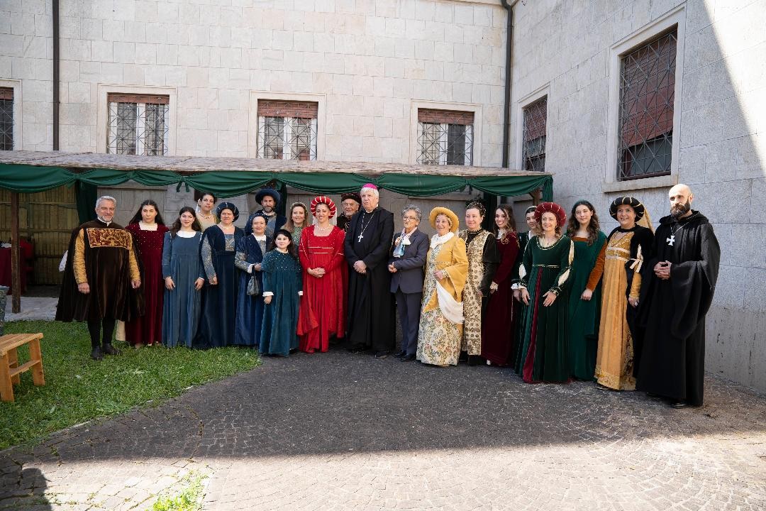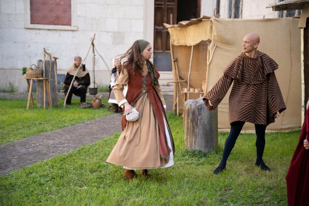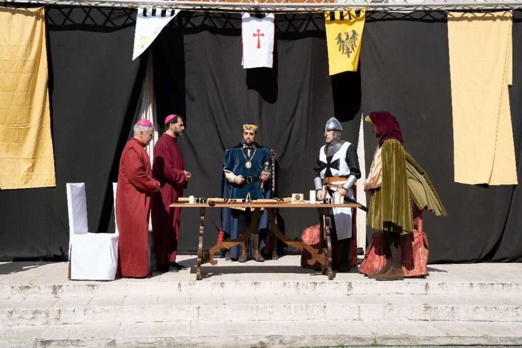 Il pubblico presente, insieme alle autorità: il Sindaco Enzo Salera, l’Abate di Montecassino Dom Luca Fallica, le assessore alla cultura Gabriella Vacca e all’istruzione e turismo Maria Concetta Tamburrini hanno potuto fare un viaggio nel tempo. Sono approdati nel 1225, quando San Germano era la capitale della SignoriaMonastica di Montecassino e proprio qui, nella Chiesa di san Germano, fu firmato l’accordo tra Papa OnorioIII° e l’ImperatoreFederico II°, per una Crociata in Terra Santa. Un accordo chiamato “La dieta di San Germano”. “Dieta” era un termine medievale con il quale si indicava un accordo. A raccontare passo passo i momenti salienti, un cronista dell’epoca al quale non a caso è dedicata una strada di Cassino. Si tratta di Riccardo Da San Germano. Colui che si occupava di raccontare anno per anno tutti fatti accaduti, trasferendo così alla storia gli eventi del territorio. Al termine della rievocazione della “dieta”, il pubblico ha potuto assistere, nel cortile del Palagio Badiale, ad una rievocazione della quotidianità della vita del tempo.Ad accompagnare i visitatori nella vecchia San Germano, attraverso un percorso guidato, un team di guide esperte. Grande soddisfazione è stata espressa in primis dall’Abate di Montecassino che ha dichiarato: “Oggi si è rievocato uno degli eventi che hanno portato alla conclusiva Pace di San Germano avvenuta proprio qui a Cassino. Interessante sarà assistere alla rievocazione dell’evento conclusivo”. Emozionata la responsabile del progetto culturale del Corteo Storico Antonietta De Luca che ha creduto, creato e voluto fortemente la realizzazione di questo progetto. Da anni la professoressa De Luca lavora per la diffusione della storia del nostro territorio con un progetto culturale che ha coinvolto per anni anche le scuole. Da ricordare l’edizione del 2019, quando il Presidente della Repubblica Sergio Mattarella visitò la “Fiera del Santo” e la rievocazione del “Placito Cassinese” nel 2023. “ E’ stato un lavoro durissimo – ha raccontato – sia perché nuovo, sia perché abbiamo dovuto creare tutto, a partire dalle scenografie, per proseguire con i costumi e poi la sceneggiatura, la regia e tanto altro. Devo però ringraziare tutti coloro che hanno collaborato con noi, in primis mio marito Antonio Tomassi che mi supporta e mi sostiene sempre. Sono contenta perché ho riscontrato grande interesse, a dimostrazione che questo è un ottimo metodo per divulgare la storia”. Soddisfatto anche il coordinatore del Corteo Storico Edmondo Mascioli: “Bello l’allestimento, bella la realizzazione delle scene. Bravissimi gli interpreti. Bravissimi tutti. Un progetto che andrà sicuramente avanti con nuove rievocazioni”.