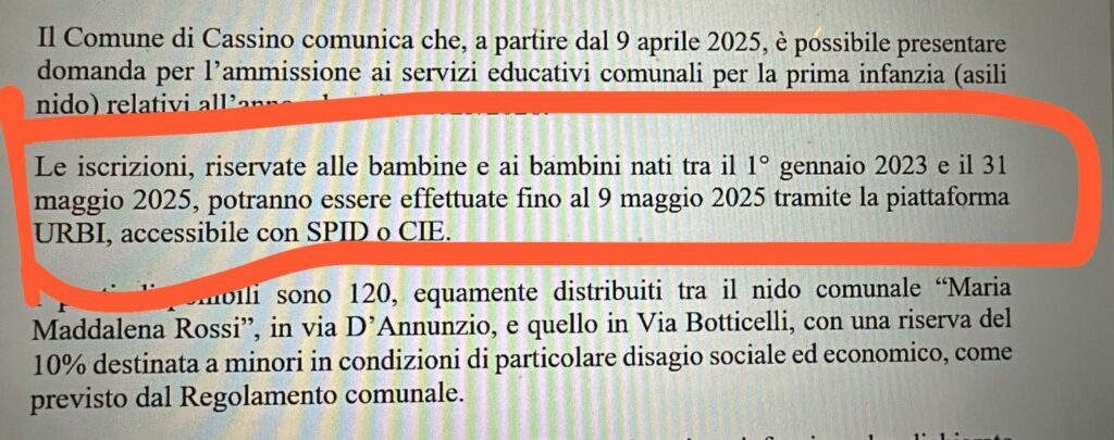 Ora, leggendo quanto scritto, viene detto che è possibile iscrivere bambini nati tra il 1° gennaio 2023 e il 31 maggio 2025, ma la domanda scade il 9 maggio 2025. Quindi un bambino, bambina nati il 12, 24, 28 maggio tecnicamente rientrano tra quelli che possono essere iscritti, ma di fatto la domanda risulta già scaduta.