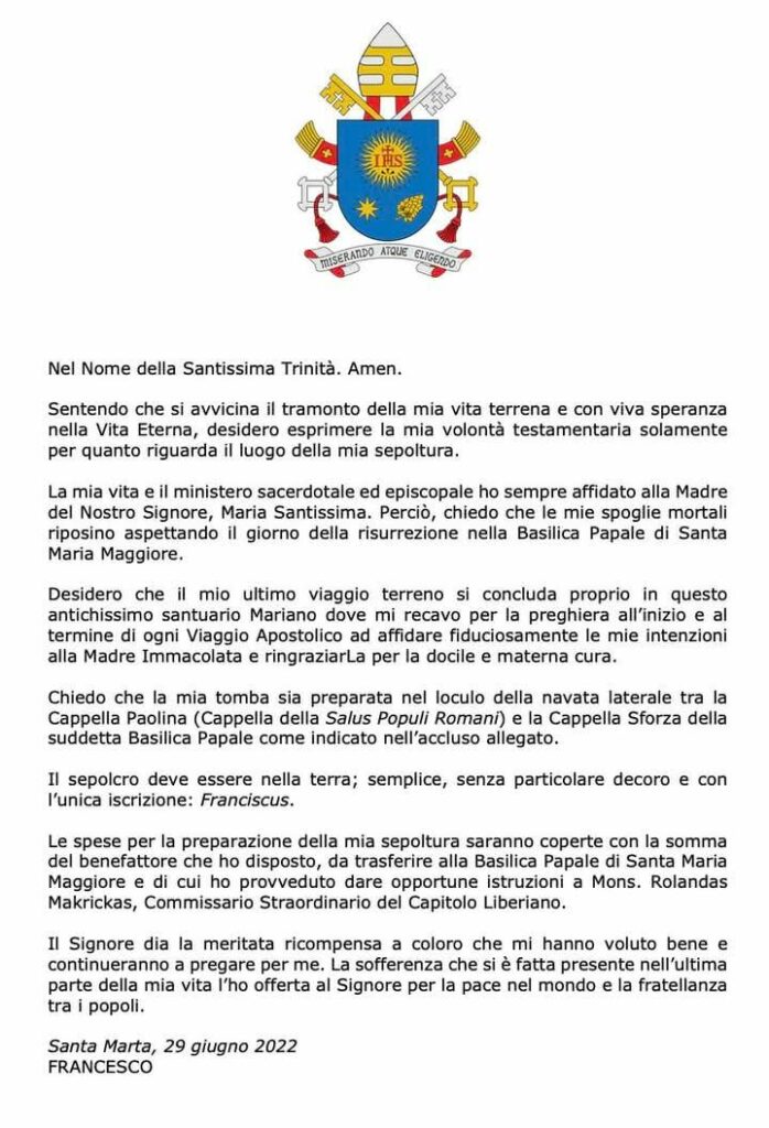 E in una lettera data 29 giugno 2022, da Santa Marta, proprio nel giorno in cui si celebrano San Pietro e Paolo, il primo Papa e l’apostolo dei “gentili” ovvero il principale missionario del vangelo di Gesù tra i greci e i romani, ha voluto disporre indicazioni per quando sarebbe arrivato il momento del ritorno alla casa del Padre.