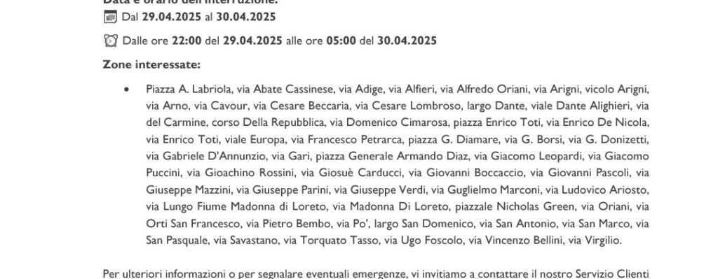L’orario di sospensione è programmato tra le 22 del 29 aprile e le ore 5 del giorno 30.