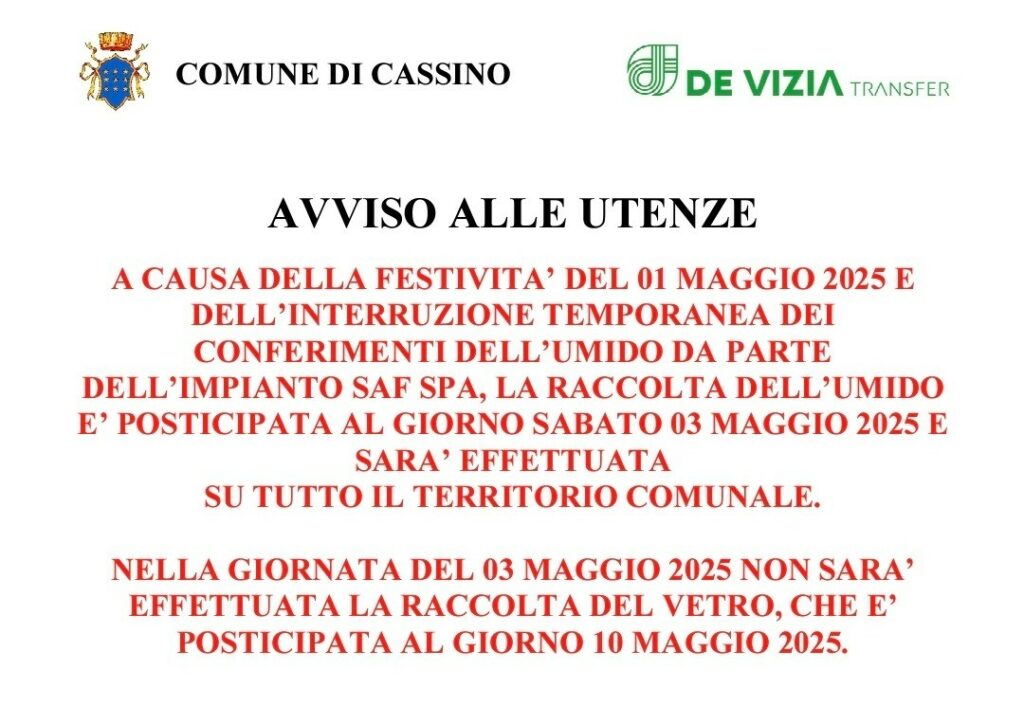 In previsione del 1° maggio sarà sospesa la raccolta dell’umido. Salta la raccolta del vetro per sabato 3, la frazione sarà ritirata direttamente il 10 maggio.