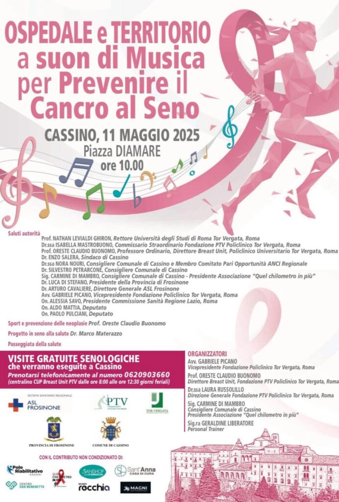 Durante la giornata saranno disponibili visite senologiche gratuite (prenotabili al numero 0620903660, dalle 8:00 alle 12:30 nei giorni feriali) e si svolgerà una passeggiata della salute. L’iniziativa è promossa dalla Fondazione Policlinico Tor Vergata in collaborazione con ASL Frosinone, il Comune di Cassino, la Provincia di Frosinone e numerosi enti sanitari e culturali del territorio.