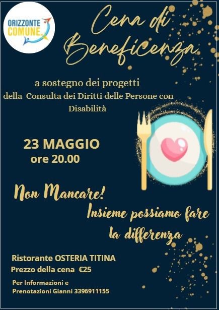 Una cena solidale a sostegno di progetti che prevedono l’abbattimento delle barriere architettoniche nel cuore della città. Un primo passo per fare la differenza. Ed è quello che Orizzonte Comune ha organizzato una serata da condividere con amici e famiglia per poter contribuire alla realizzazione di alcuni progetti promossi dalle associazioni che fanno parte della Consulta per i Diritti delle Persone con Disabilità
