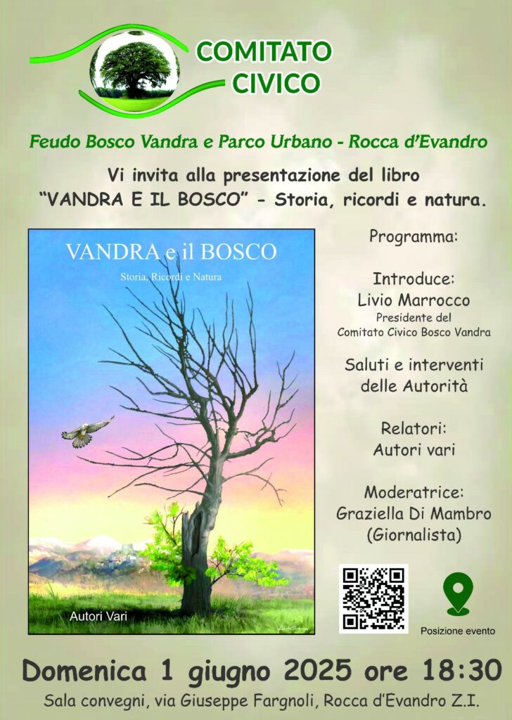 Appuntamento domani, domenica primo giugno a Rocca d’Evandro alle ore 18:30 nella sala convegni Fragnoli, via Fragnoli zona industriale, presentazione del libro: “Vandra e il bosco , storia ricordi e natura “. Moderatrice, la giornalista Graziella Di Mambro. Livio Marocco Presidente Comitato Civico ” Feudo Bosco Vandra e Parco Urbano” evidenzierà il valore ambientale, culturale e morale che ha svolto il Comitato Civico in 15 mesi di lavoro, scoperte sul campo, interviste e anche fasi di divertimento. L’unica finalità è stata quella di arrivare all’ appuntamento del primo giugno , con questa importante novità editoriale.