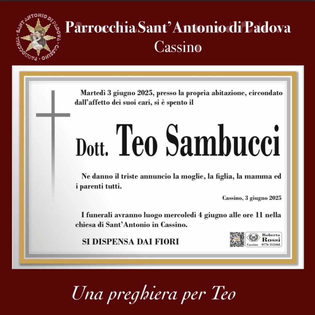 Teo si è spento a casa, circondato dall’affetto dei suoi cari. Lascia la moglie e una figlia adolescente. Aveva solo 54 anni. Rinomato commercialista ha, negli anni, ricoperto il ruolo di revisore dei conti per diversi comuni, tra cui anche Cassino. Attualmente era revisore legale alla Saf e al Comune di Arce ed era segretario del Consiglio dell’Ordine dei Commercialisti di Cassino.