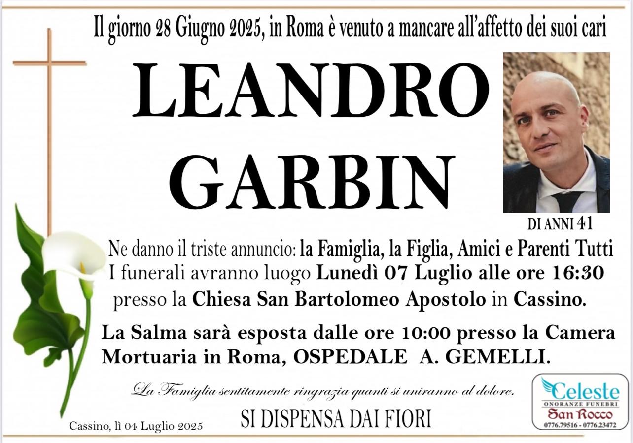 Si svolgeranno lunedì alle 16.30 i funerali di Leandro Garbin. Le esequie saranno celebrate nella chiesa di San Bartolomeo. La prematura e improvvisa morte del quarantunenne ha lasciato nel più profondo sconforto i familiari e numerosi amici. Un intero quartiere e la comunità sono in lutto per la dolorosa perdita. Leandro è morto dopo una settimana in cui ha combattuto tenacemente per la vita.