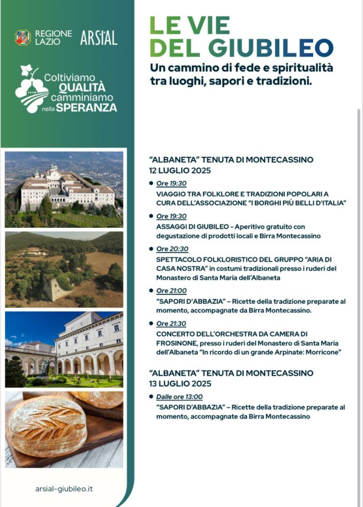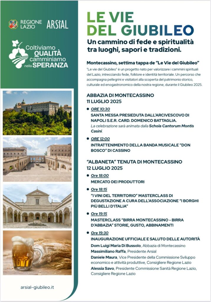 “Montecassino – è il commento del Presidente di Arsial Massimiliano Raffa – rappresenta un patrimonio di straordinario valore storico-culturale. Con “Le Vie del Giubileo”, Arsial intende valorizzare l’integrazione tra patrimonio spirituale, tradizioni agricole e filiere enogastronomiche regionali. La nostra Agenzia sostiene i territori attraverso politiche di sviluppo che coinvolgono cammini, produttori locali e comunità rurali. Il Giubileo 2025 costituisce un’opportunità strategica per promuovere l’eccellenza del sistema agroalimentare laziale. Il progetto “Le Vie del Giubileo” – ha precisato Raffa – è strumento operativo per rafforzare le connessioni territoriali e generare nuove opportunità per le filiere produttive. Il Modello Lazio si fonda su questo approccio: valorizzazione delle tradizioni attraverso l’innovazione tecnologica e l’integrazione tra identità locale e sviluppo sostenibile”.