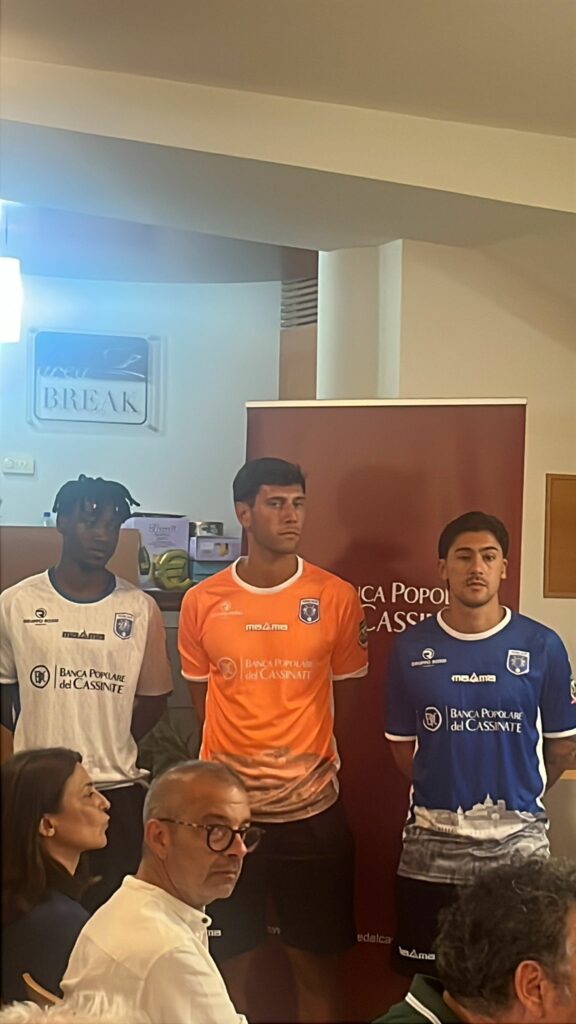 Sono state presentate le nuove divise che la platea gremita ha accolto con emozione, sulla maglie di colore azzurro, bianco e arancione l’effige di Montecassino e la scritta PAX.