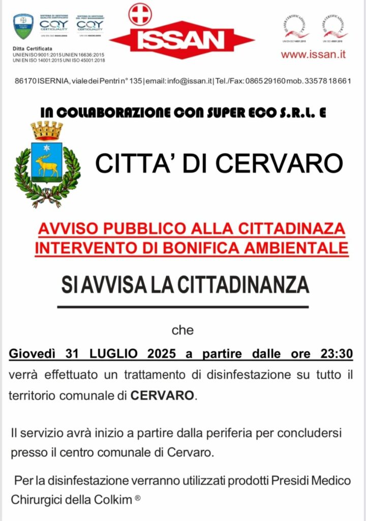 “Giovedì 31 LUGLIO 2025 a partire dalle ore 23:30 verrà effettuato un trattamento di disinfestazione su tutto il territorio comunale di CERVARO.