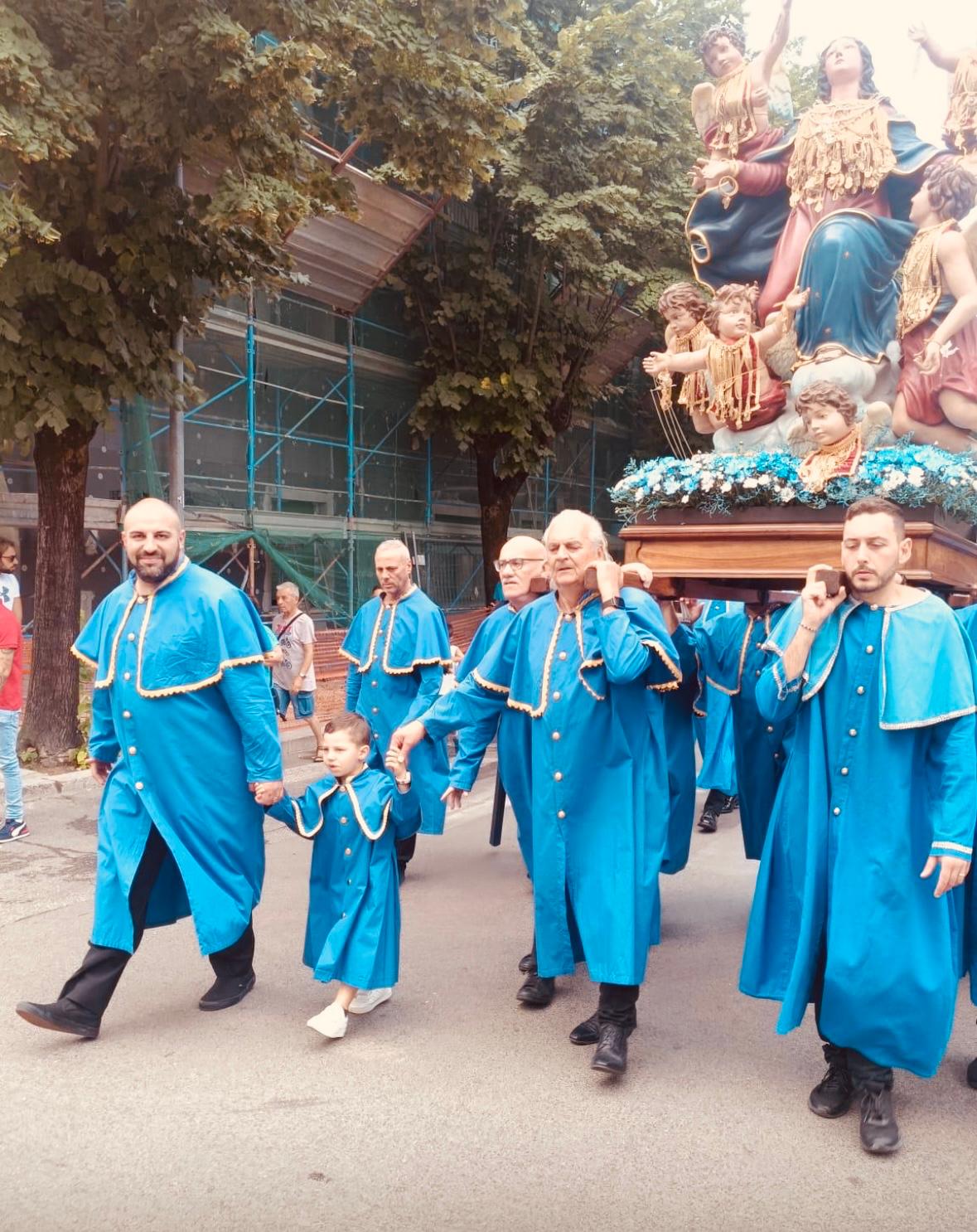 E ai piedi della Madonna il piccolo Raffaele, nella sua mantellina blu, con il cappellino dei Paw Patrol e un santino stretto forte nella manina ci regala il momento più bello dei festeggiamenti in onore dell’Assunta degli ultimi anni, perché ci ricorda che la semplicità e la verità dei gesti puri e di cuore, battono tutto. Che la forza di volontà può essere grande anche in un bimbo di soli tre anni molto motivato. E quello sguardo innamorato verso la statua dell’Assunta, il sorriso felice per essere lì sono molto più forti di qualsiasi omelia o messaggio lanciato dal pulpito. Non si tratta solo di tradizioni o di devozione, ma di un reale affidamento come solo un bambino può fare verso una madre, con il cuore e un amore senza limiti.