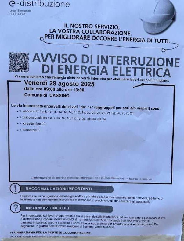 A causa di interventi sull’impianto questa mattina diverse le abitazioni che sono senza corrente. Il servizio sarà rispristinato alle 13 circa.