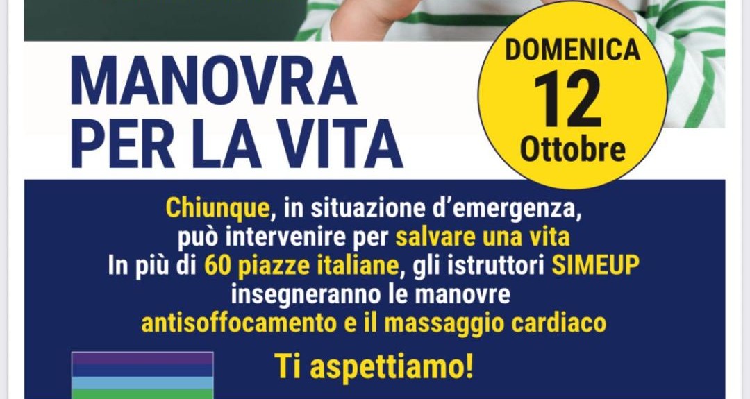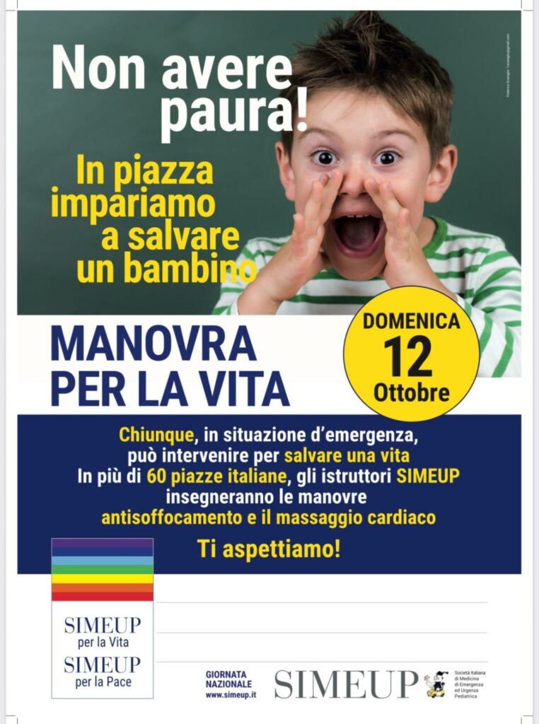 Il 12 ottobre alla Casa della Salute di Pontecorvo l’ASL Frosinone, dalle 10 alle 13, con la Società Italiana di Medicina di Emergenza Urgenza Pediatrica (SIMEUP), aderisce alla campagna “Manovra per la Vita”: oltre 60 piazze italiane dove pediatri e infermieri insegnano a genitori, insegnanti e cittadini le manovre salvavita di disostruzione pediatrica.
