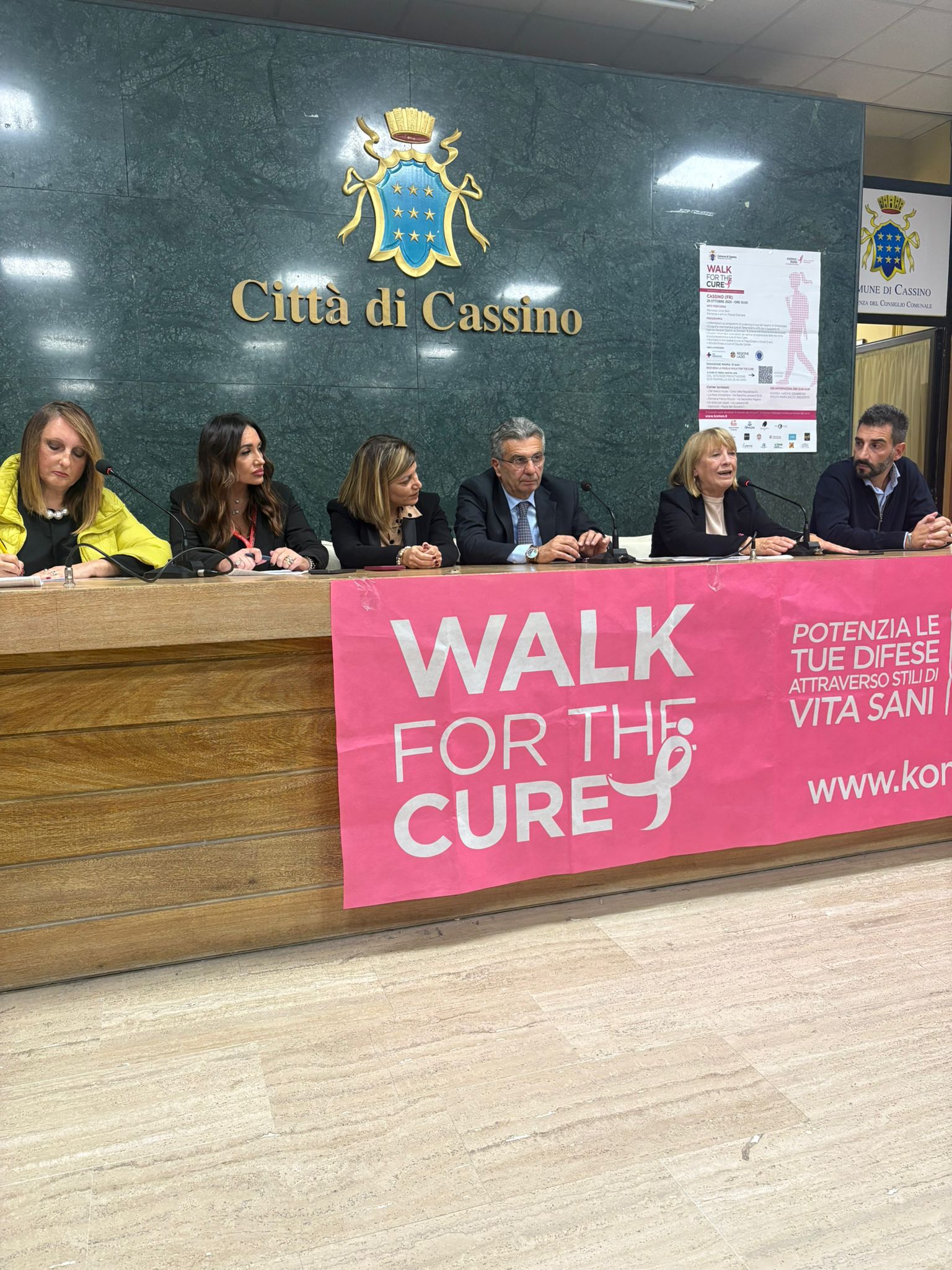 Si è svolto ieri pomeriggio la conferenza stampa in prossimità dell’evento “Walk for the cure”, che vedrà scendere in Piazza la cittadinanza di Cassino e dintorni , per mettersi in marcia nel segno della prevenzione e della lotta contro il tumore al seno. Al via, quindi, la seconda edizione dell’evento, diventato manifestazione permanente a seguito, come sottolineato dal sindaco Enzo Salera, della mozione presentata il 16.01.2025 dal consigliere Andrea Varone. Un segno concreto e indelebile della sensibilità dell’intera comunità verso la prevenzione, quale unica arma contro la malattia, che sempre di più colpisce anche in età giovanile, con una diffusione sempre più preoccupante. Il Consigliere Varone ha ricordato i primi passi dell’anno scorso verso l’organizzazione dell’evento, in conformità anche alla sua attività di medico impegnato spesso nelle prime diagnosi della malattia; un evento al quale ha contribuito il Consiglio dell’Ordine degli Avvocati di Cassino, nella persona della segretaria Grazia Maria Sacco, sposando a pieno il progetto di donazione e sostegno a favore della Komen, da anni impegnata nella ricerca delle cure e nella sensibilizzazione alla prevenzione.