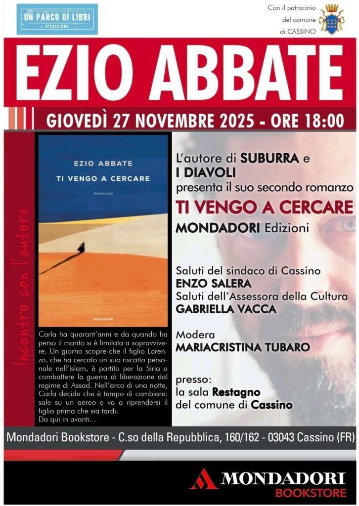 Ezio Abbate, l’autore cassinate di serie tv cult come “Suburra”, “Suburraeterna”, “I Diavoli”, e “Squadra Mobile”, presenterà domani, giovedì 27 novembre, alle ore 18, presso la sala Restagno del Comune di Cassino, il suo romanzo “Ti vengo a cercare”, nell’ambito della sesta edizione della rassegna “Un Parco di Libri”.