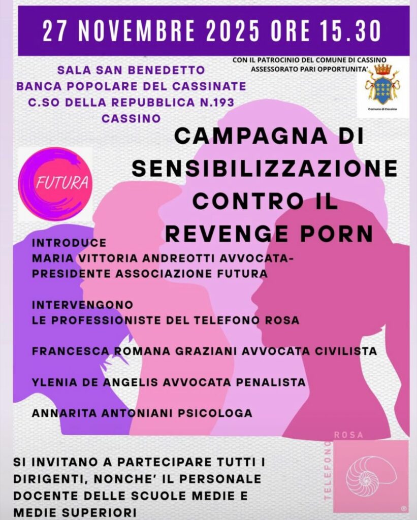 Saranno presenti le professioniste del Telefono Rosa, Francesca Romana Graziani, avvocato civilista; Ylenia De Angelis, avvocato penalista e la psicologa Annarita Antoniani. L’invito è stato rivolto in particolare al personale scolastico, docente e non solo, delle scuole medie e superiori.