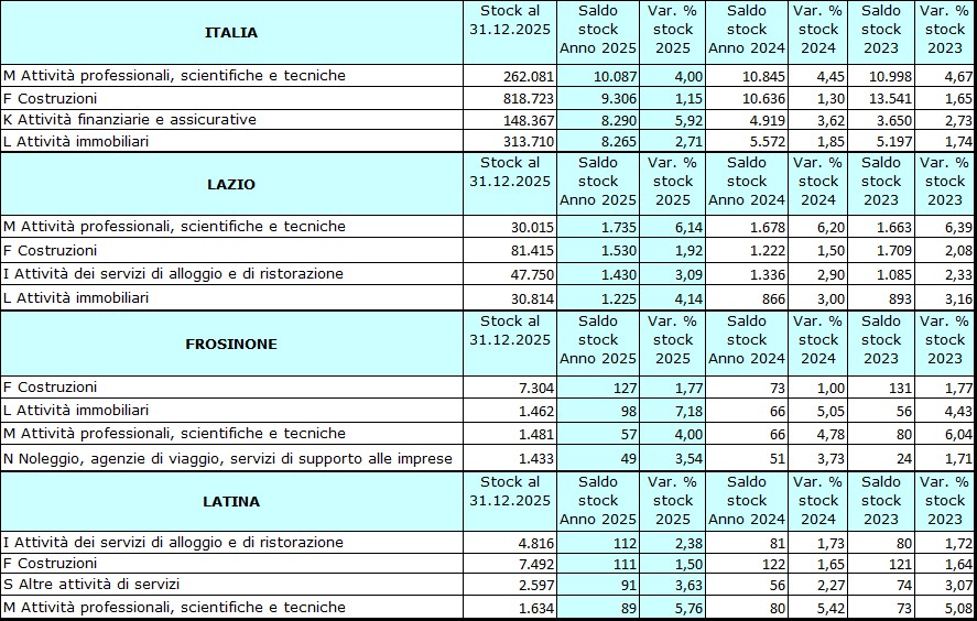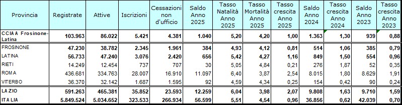 Il bilancio dell’area vasta di Frosinone e Latina è positivo per 1.040 imprese (a fronte delle 1.363 aggiuntive dello scorso anno); la performance più contenuta è condivisa da entrambi i territori, per effetto del ridimensionato turnover imprenditoriale, determinato dal rallentamento più accentuato delle iscrizioni. Il denominatore comune ad entrambe le province è il maggiore affanno dei settori tradizionali: industria, commercio e agricoltura; per quest’ultimo occorre sottolineare che il confronto rispetto alle dinamiche più vivaci dello scorso anno è penalizzato dal venire meno dell’effetto delle risorse messe a disposizione dal PSR, che hanno alimentato i saldi positivi targati 2024.