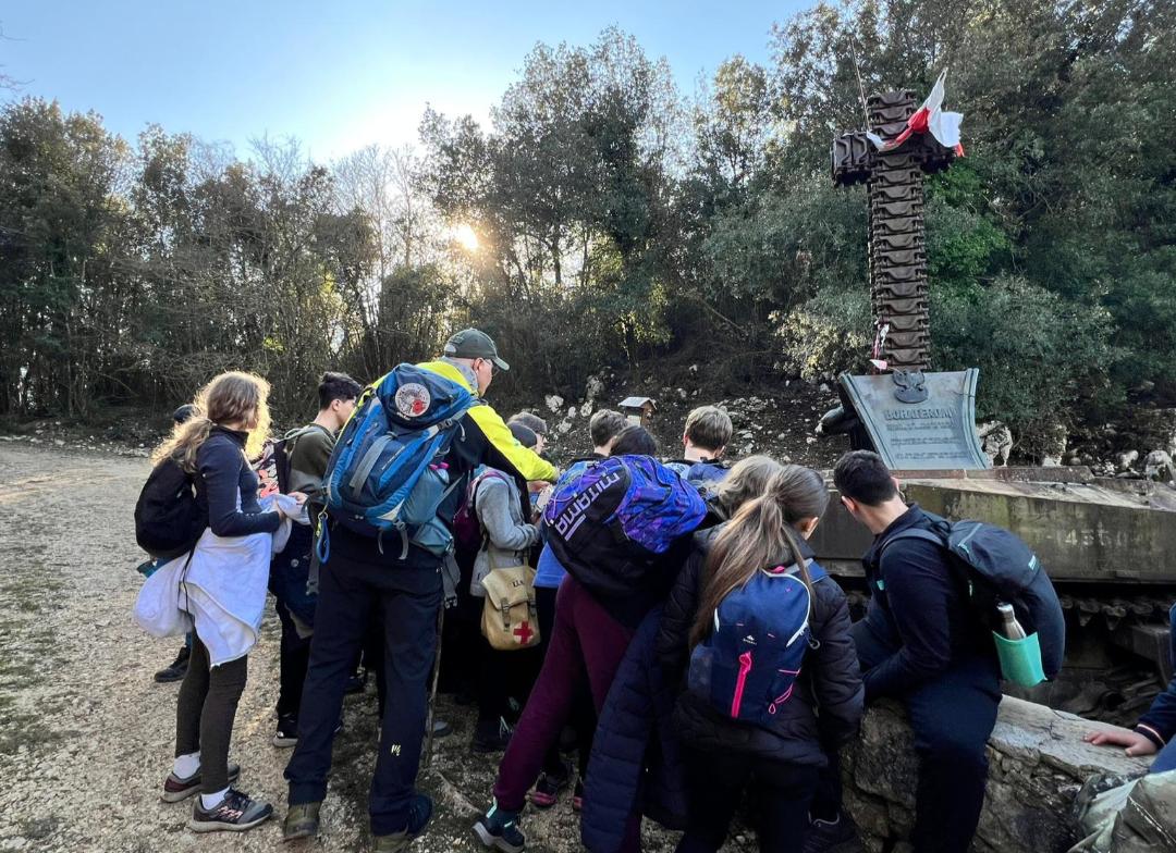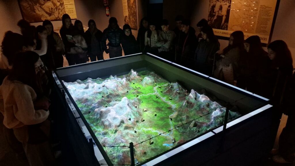 L’esperienza di questi giorni ha dimostrato che quel modello funziona, e ha aggiunto una terza componente che Rambaldi non aveva previsto: i testimoni viventi. Durante le giornate all’Historiale, nella Sala Rambaldi, gli studenti hanno ascoltato le parole dell’Abate di Montecassino Dom Luca Fallica e le testimonianze di cassinati che nel dopoguerra erano bambini. “È come un triangolo”, sintetizza Valente. “Il racconto multimediale del museo, l’esperienza diretta sul territorio e la voce di chi c’era. Togli un lato e crolla tutto. Ma quando funzionano insieme, i ragazzi non stanno più studiando la storia: la stanno vivendo.” Sul territorio, Valente ha sperimentato con i ragazzi un approccio immersivo: il paragone tra il paesaggio della Linea Gustav e una partita a dama, dove ogni altura è una pedina e ogni corso d’acqua una linea di difesa. I ragazzi hanno percorso a piedi le retrovie tedesche, si sono fermati davanti alla grande grotta crollata – prima rifugio per i civili cassinati, poi posizione difensiva tedesca – e sono arrivati al Carro Armato Białecki, monumento al 4° Reggimento Scorpion del 2° Corpo del Generale Anders. “Il territorio è il nostro maestro più potente”, afferma Valente. “Noi dobbiamo solo imparare a farlo parlare.”