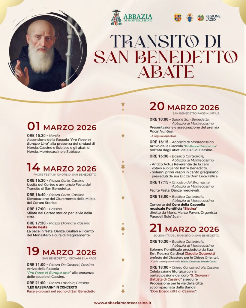 Gli appuntamenti in programma, che si ultimeranno il 21 marzo, si inseriscono nel solco del cammino relativo all’anniversario del 2029, quando l’Abbazia di Montecassino celebrare i suoi 1500 anni.