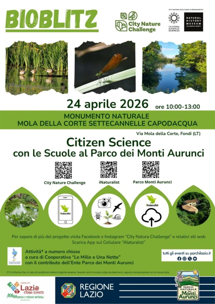 Di seguito, gli appuntamenti organizzati sul territorio aperti liberamente alla cittadinanza e nello specifico abbiamo organizzato delle attività con le Scuole. Il progetto coinvolge attivamente infatti anche il mondo dell’istruzione con un appuntamento dedicato che si svolgerà il 24 aprile dalle 10:30 alle 12:30 e che vedrà protagonisti gli studenti delle scuole secondarie della città di Fondi, rispettivamente presso il Monumento Naturale “Mola della Corte – Settecannelle – Capodacqua”, Via Mola della Corte, Fondi LT (ingresso lato Mulino), in un percorso di educazione ambientale e ricerca sul campo guidati da Educatori, Guide ed Operatori della Cooperativa “Le Mille e Una Notte” che supporterà il Parco in questa prestigiosa iniziativa di Educazione Ambientale alla Sostenibilità e Citizen Science.