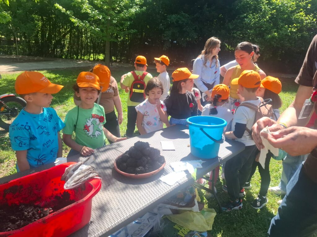 Arrivati alla villa comunale, dopo una merenda condivisa, è partito il laboratorio: i bambini realizzeranno le “bombe di semi”, sperimentando in modo semplice ma significativo le proporzioni tra terra, acqua e semi, dove la matematica si intreccia con la cura del vivente.