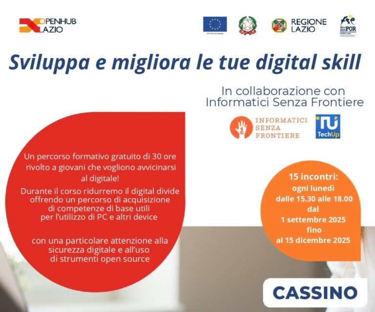< 1 MIN Un’occasione aperta a tutti e promossa dall’OpenHub della Regione Lazio. Il corso si terrà una volta a settimana fino a dicembre