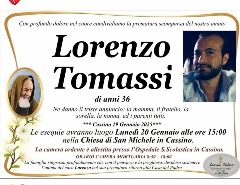 Domani pomeriggio l’ultimo doloroso saluto a Lorenzo Tomassi