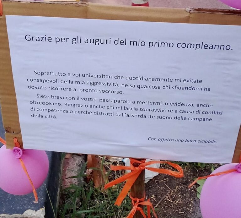 Un cartello “speciale” per una buca che compie un anno: la provocazione corre sui social