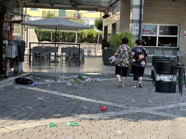 < 1 MIN Ore 8.00 o giù di lì. Mucchi di plastica, bottiglie e vetri a terra. E questa una parte di Piazza Labriola che si trovano di fronte i cittadini di Cassino.